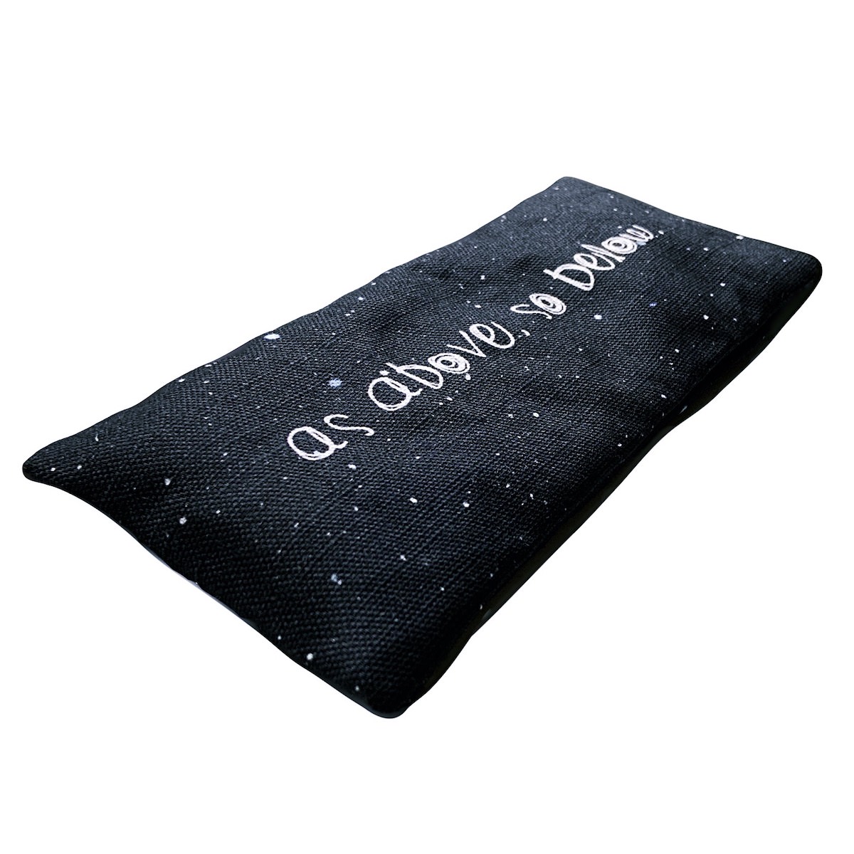 Im Gegensatz zum Moon Child Augenkissen ist das “as above, so below” Augenkissen mit 175g minimal schwerer. Es passt sich der Augenpartie aber dennoch perfekt an. Außerdem kommt es durch seine Füllung ohne Lavendel etwas weniger duftintensiv um die Ecke. Es duftet leicht krautig nach Beifuss. Dadurch, dass der Außenstoff schwarz ist, könnt ihr darüber hinaus auch 1-2 Tropfen eures liebsten Aromaöls auf den Außenstoff geben.